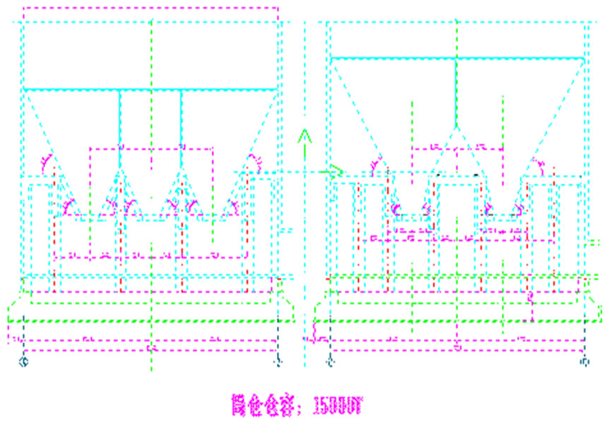 煤倉倉容:15000T,直徑:25000m,煤倉底部設計6個錐形落煤口均布,落煤口錐體斜面水平傾角為60°和72°
