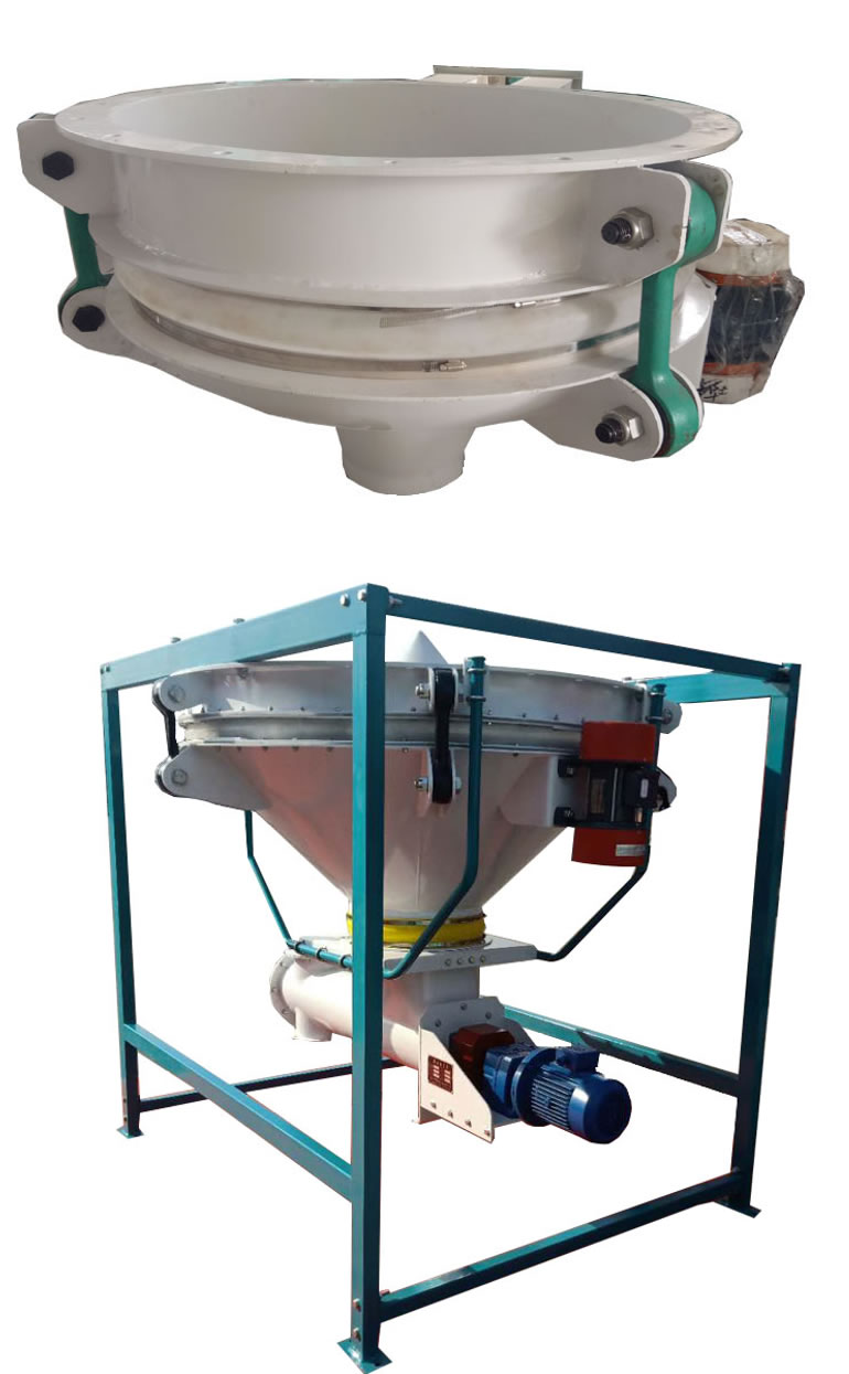 其原理是物料從倉底落下,物料進入下面卸料斗,通過振動電機驅動卸料斗做高頻振動,物料受振動后,經過卸料盤中間及四周均勻緩慢地流下來。從而改善了物料的流動性,使物料穩(wěn)定均勻,同時倉內物料不易結拱。