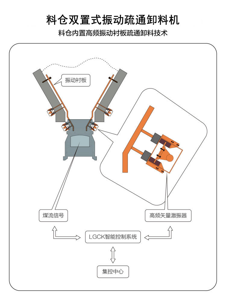 專利技術(shù)SGZP-□-□系列煤倉雙置式振動(dòng)疏通卸料機(jī),是我公司引進(jìn)德國喬斯特〔JOST Company〕公司,先進(jìn)的亞共振、振動(dòng)破拱技術(shù),采用國際前沿的雙相彈性矢量壓縮,動(dòng)量緩沖低頻振動(dòng),區(qū)段振幅異步倍增,設(shè)備機(jī)體內(nèi)外分置等技術(shù),配合LGCK-□-□系列煤流射頻傳感自動(dòng)監(jiān)測系統(tǒng),精確控制設(shè)備的有效運(yùn)行,徹底解決煤礦井下中轉(zhuǎn)煤倉,選煤廠儲(chǔ)煤倉、緩沖倉、受煤坑、閘門溜槽、導(dǎo)料槽、分流槽等關(guān)鍵部位,因煤位靜置而產(chǎn)生的結(jié)拱堵塞問題,適合各類水份大,黏度高,易結(jié)拱的煤種。