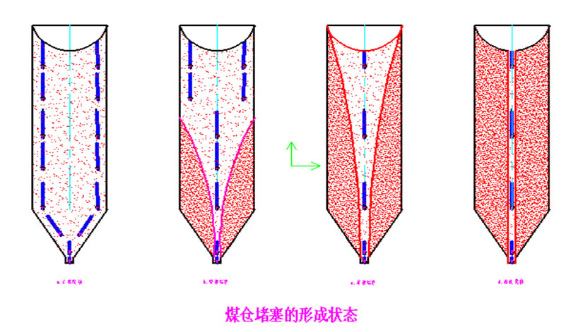 燃煤在煤倉中粘結(jié)掛壁,層層積累,使得倉容變得越來越小,逐步形成管狀落煤通道,終結(jié)拱堵塞,落煤完全終止,煤倉停止工作。