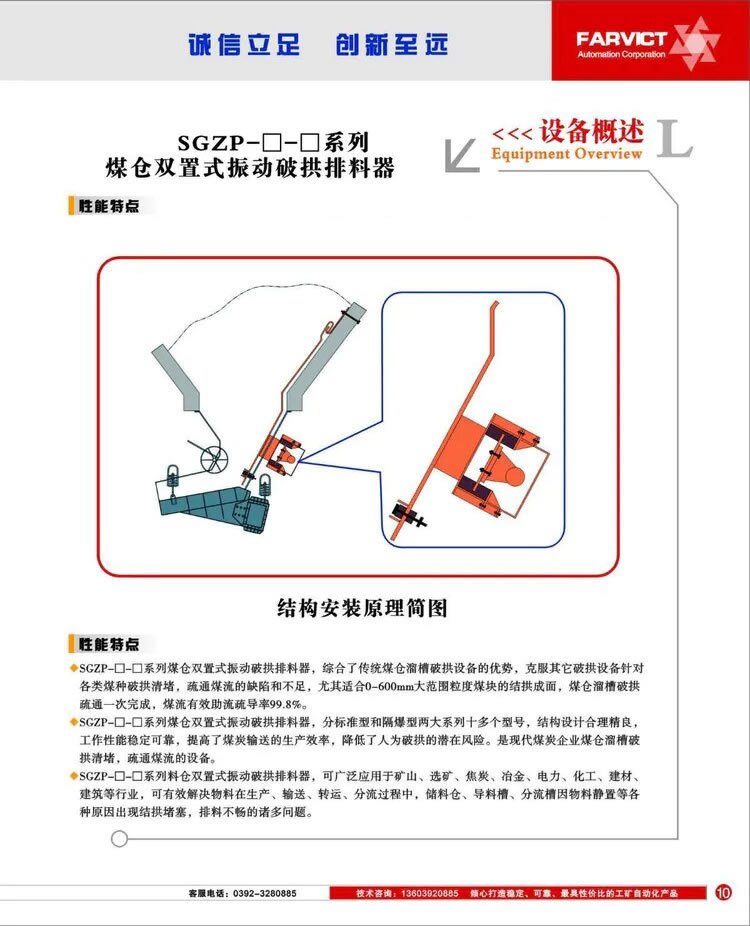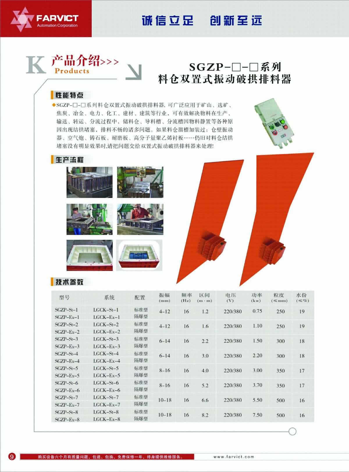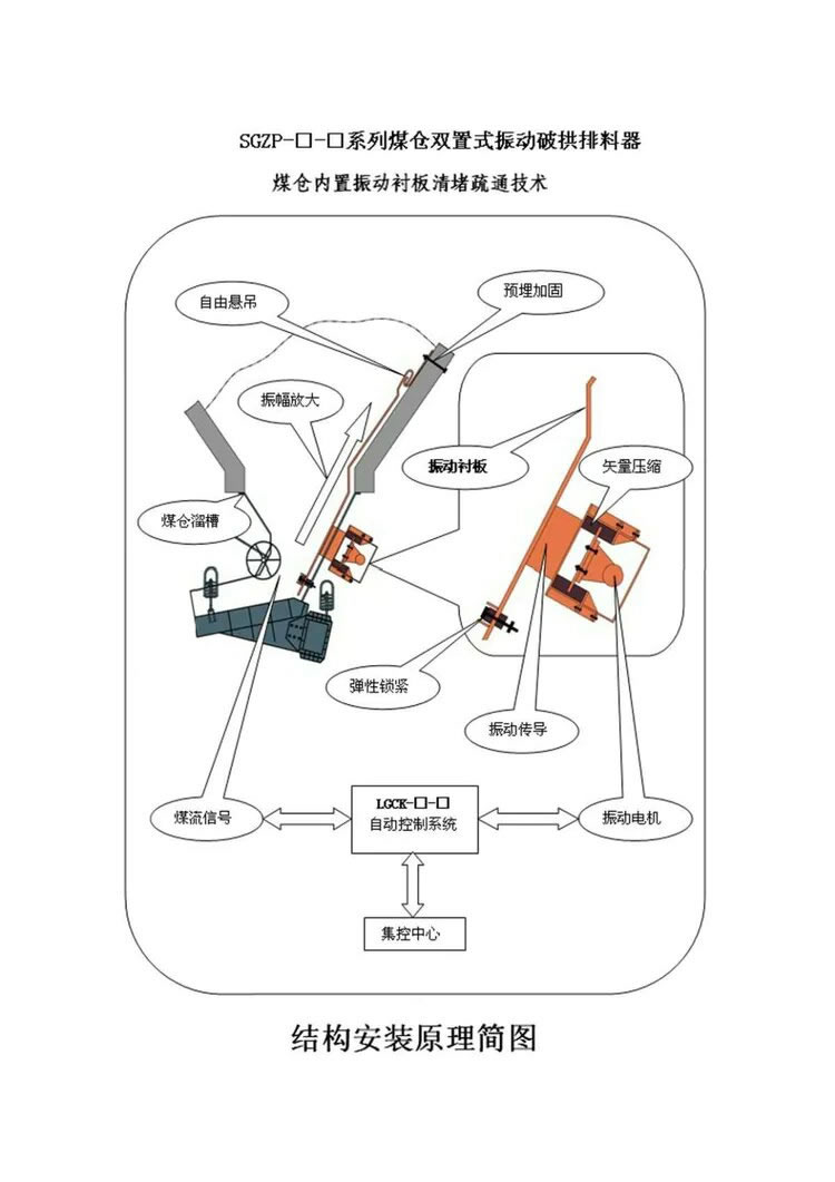 其中,SGZP-[]-[]系列煤倉雙置式振動破拱器,是我公司引進德國喬斯特〔JOST Company〕公司,國際先進的亞共振、振動破拱技術,徹底清除煤倉、溜槽,煤流的靜置結拱、堵塞問題,配合煤位射頻自動化監(jiān)測系統(tǒng),精確控制設備的有效運行,節(jié)能降耗。適用于煤礦井下中轉煤倉,選煤廠儲煤倉、緩沖倉、閘門溜槽,因煤種水分大、黏度高、易結拱,煤流堵塞的關鍵部位,煤流破拱疏通有效率:99.8%。是煤礦、選煤廠在煤炭輸送關鍵環(huán)節(jié),破拱清堵、疏通煤流的機型?蓮V泛應用于礦山、選礦、電力、化工、焦炭、冶金、建材、建筑、糧食、制藥等行業(yè)物料輸送的關鍵環(huán)節(jié)。